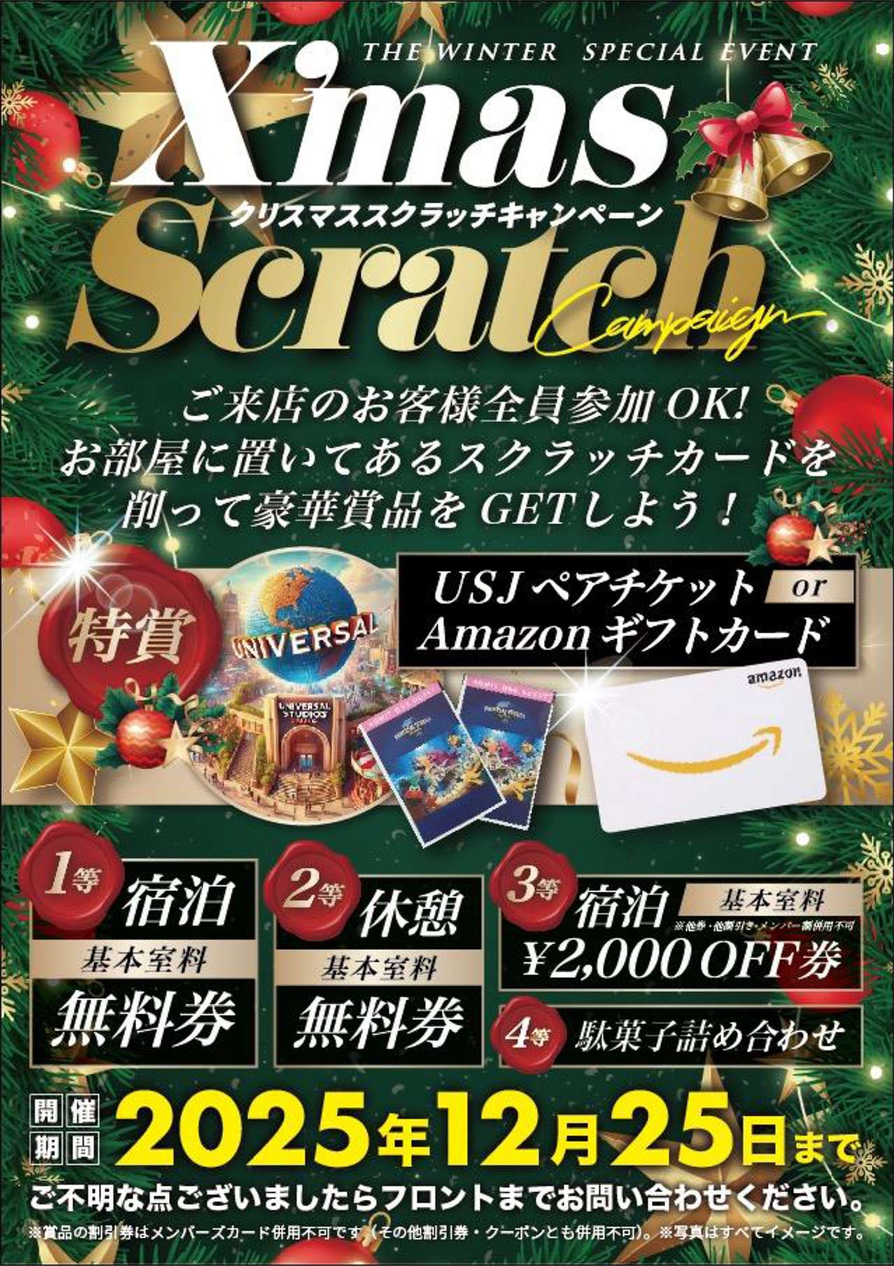 2025 クリスマス スクラッチキャンペーン クリスマス スクラッチキャンペーン! スクラッチカード無料配布中! ご来店のお客様全員参加OK! お部屋に置いてあるスクラッチカードを削って 豪華賞品をGET! 詳しくは画像をタップしてください