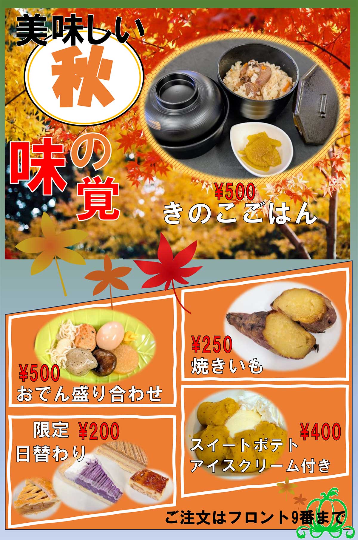 2025 秋の味覚フェア 秋の味覚フェア開催! 美味しい秋の味覚をご堪能ください きのこごはん おでん盛り合わせ 焼きいも スイートポテト&アイスクリーム 限定日替わりメニュー ご注文はフロント9番まで