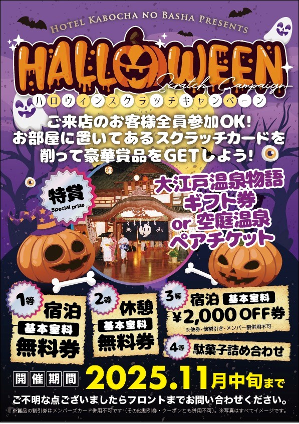 ハロウィン スクラッチキャンペーン ハロウィン スクラッチキャンペーン! 11月中頃まで開催! ご来店のお客様全員参加OK! お部屋に置いてあるスクラッチカードを削って 豪華賞品をGET! 詳しくは画像をタップしてください
