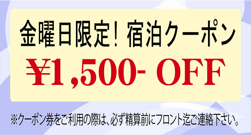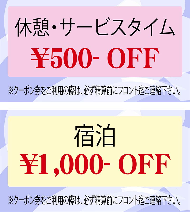 WEB限定クーポン 全日利用OK! 休憩・サービスタイム \500-OFF宿泊 \1,000-OFF ホテルスタッフに「クーポン使用」とお伝えください。 有効期限: ※メンバーズカード、他券割引きとの併用は不可 ※当クーポンをご利用の場合は、入室後10分以内に必ずフロント9番までご連絡ください。 ※ご退室後(ご精算後)はご利用になれませんのでご了承ください。 ※現金との引き換えは不可。